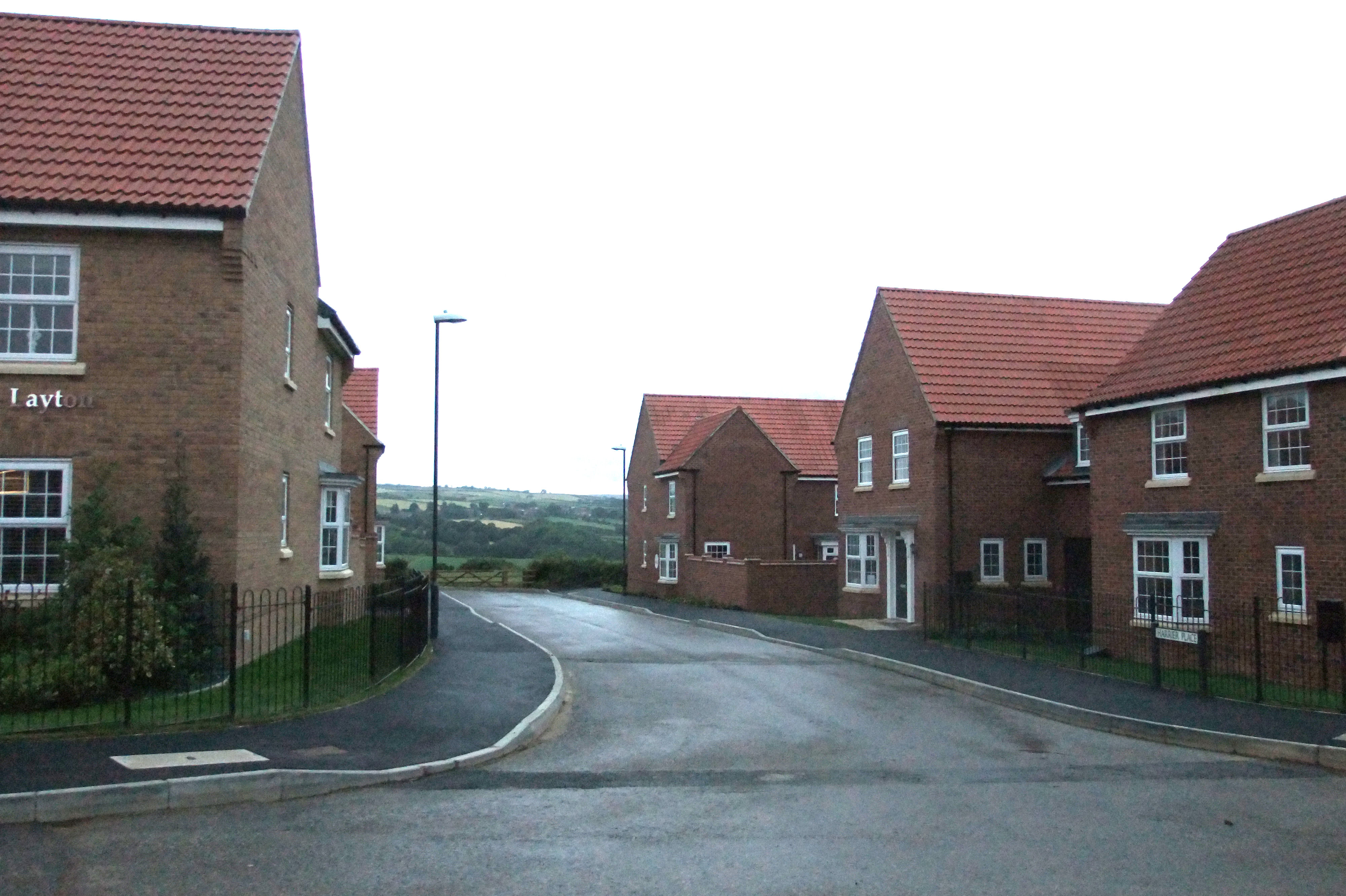 Bottom left & right: From within the development looking up towards the entrance from Meadowfields; The street name sign