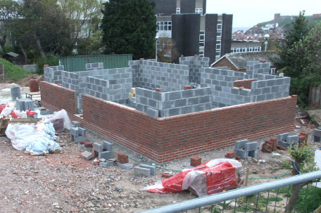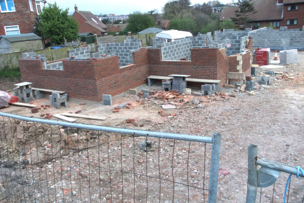 Above left: The empty space left by the demolition of a garage at 31 Coach Road, Sleights; Centre: Building built up to ground floor level; Centre right: Work progressing at 31 Coach Road; Right: House almost built