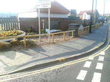 Nearby, shrubs which lined Langborne Road outside Endeavour Wharf were removed and replaced with boulders with one of them carved into the shape of a whale's tail. Bark was laid in place of soil and in June 2015, a small fence was erected to presumably prevent people from walking on the bark. The fence however did take a lot longer to erect than necessary, as the posts were put in one day, with one cross bar put across the top between two of the posts & left for around two weeks before the rest of the horizontal tops were attached! During the first stages of the work, back in 2014, the Co-operative food store had the top of its concrete bollards painted yellow, to allow them to stand out more to the partially sighted.