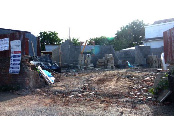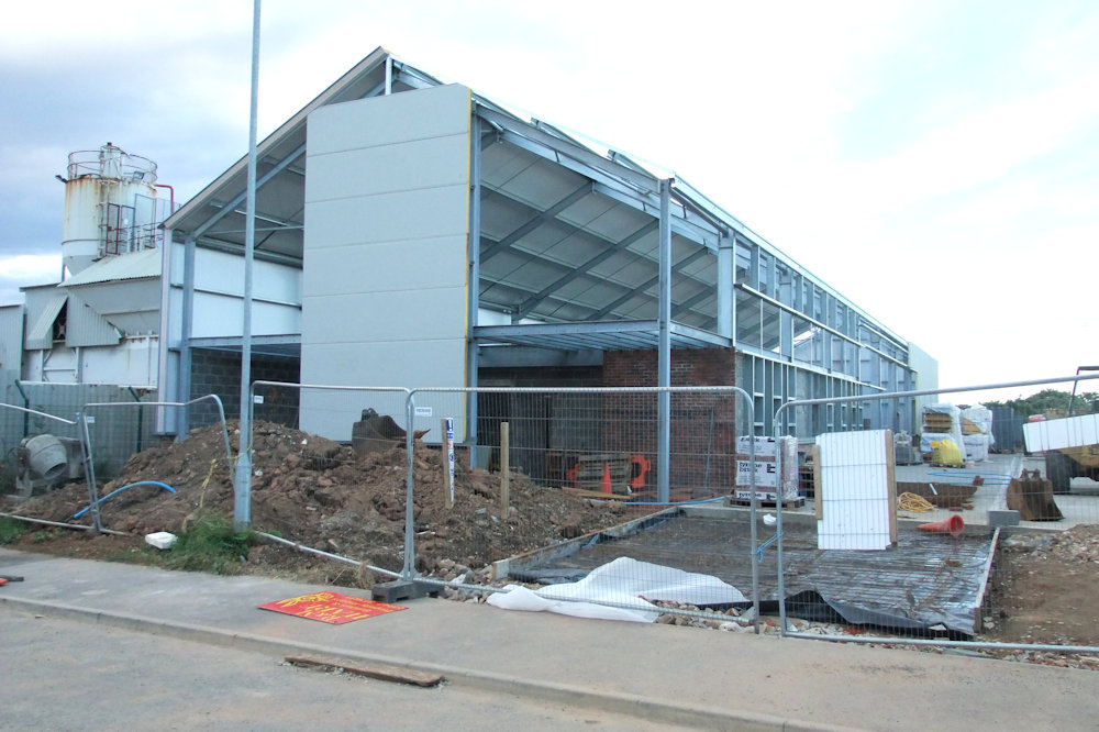 Universal Garage 2 weeks after the photos above; Left: Looking into the site from the corner of Wellington Road/Station Square, roof has been started & pillars added;
