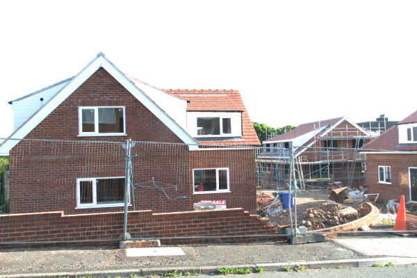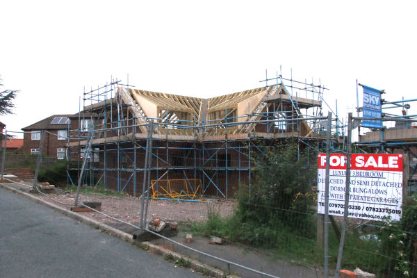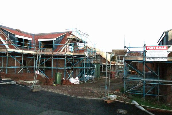 Left: The last semi-detached plot complete, initially meant to be a detached property; Right: Garages going up the centre of the photo
