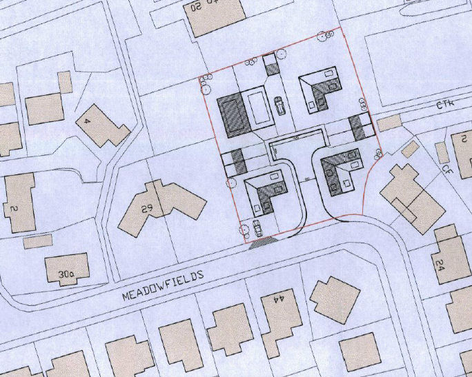Above from left: The housing development on the site of the former 27 Meadowfields with the front left plot, rear left plot, front right plot & a view straight into what will be the entrance drive respectively