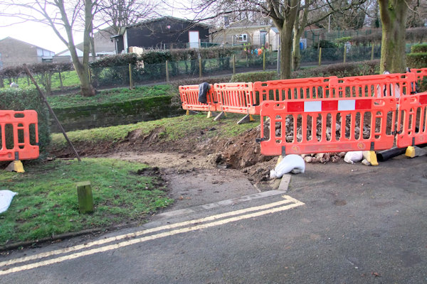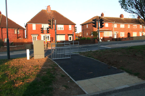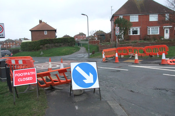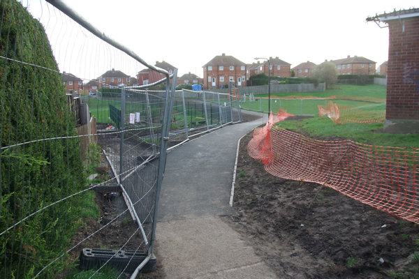 The new footpath round Four Lane Ends roundabout towards Mayfield Road; Work