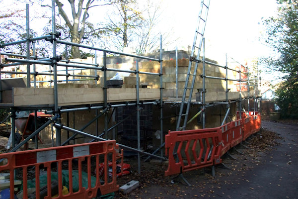 Above from left: Perimeter wall coming along nicely; Cover going on