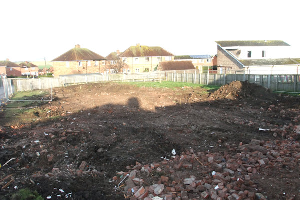 Above from left: The site looking up towards the telephone exchange; Block work started looking towards Spring Hill