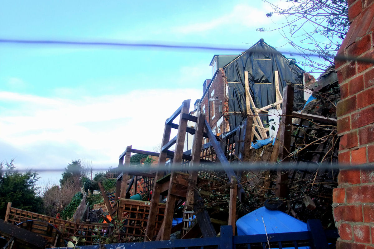 Above Right: The house in the centre of the photo was evacuated due to its location being directly below Aelfleda Terrace. Also showing a very leaning tree, which is leaning towards the rear of a block of flats