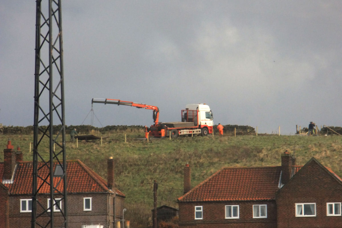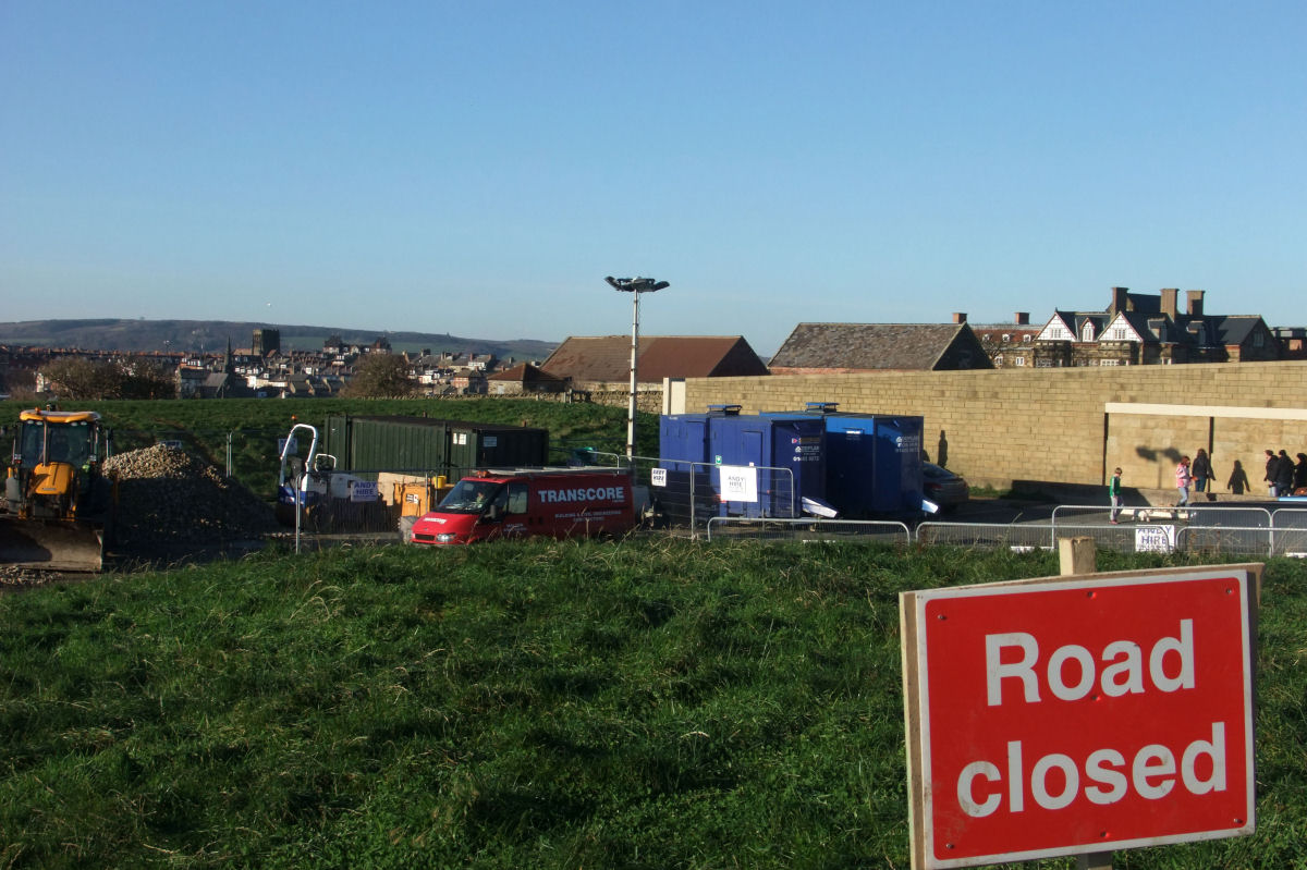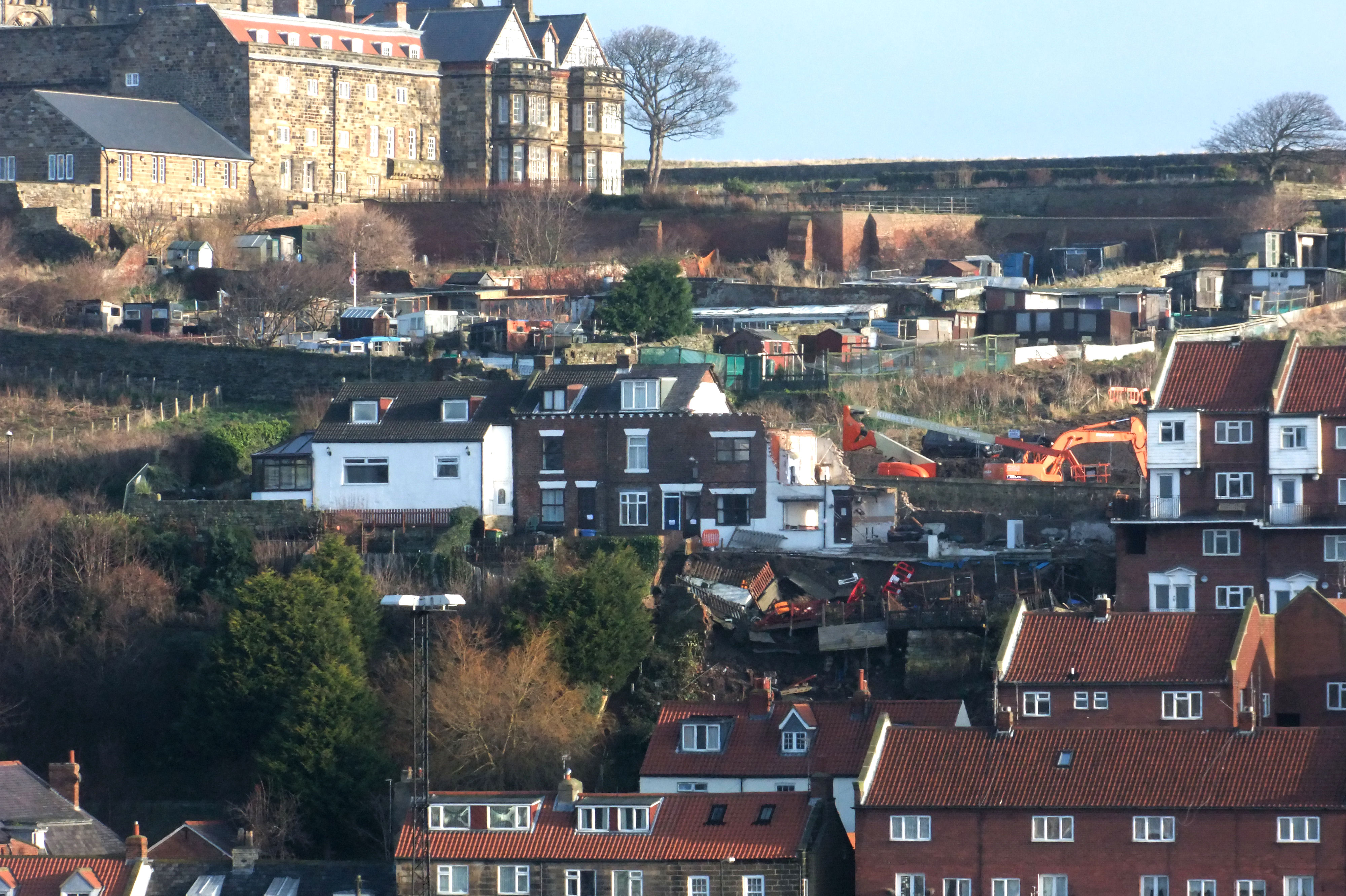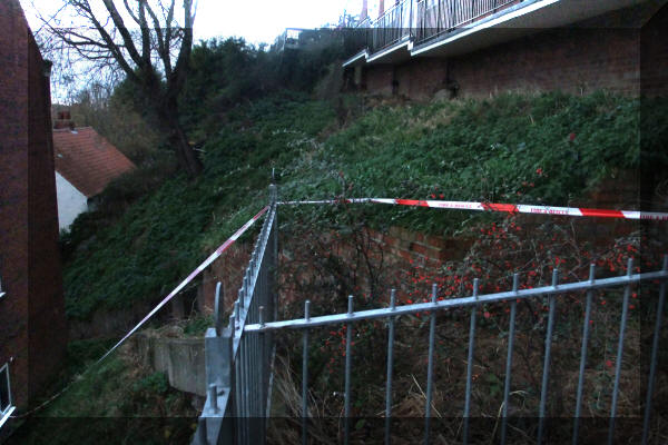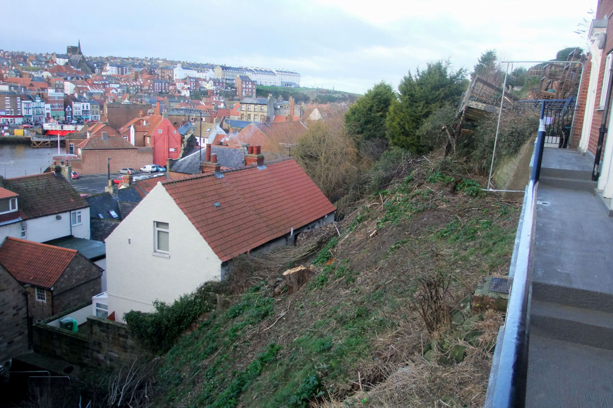 Above Left: Looking up to Franks Terrace with Aelfleda Terrace just beyond and further back. The landslip can be seen at the end of the railings